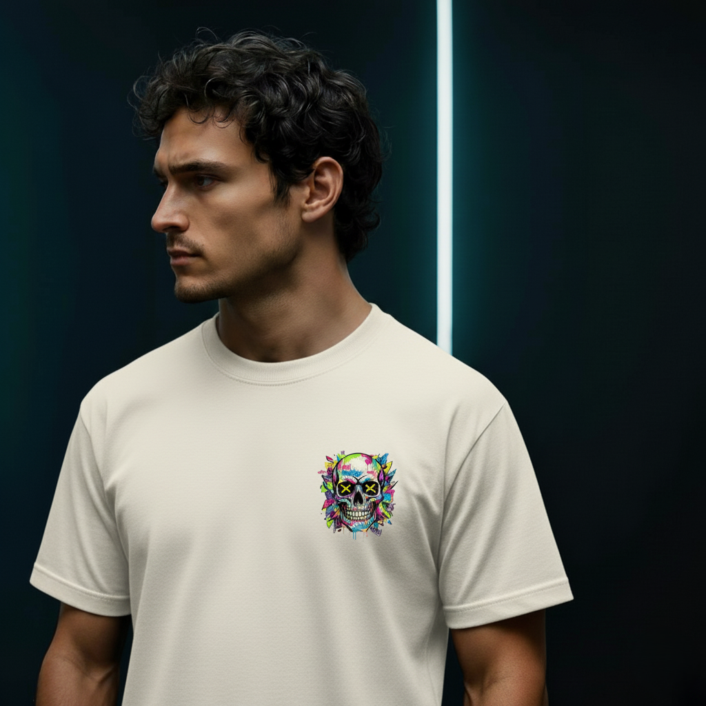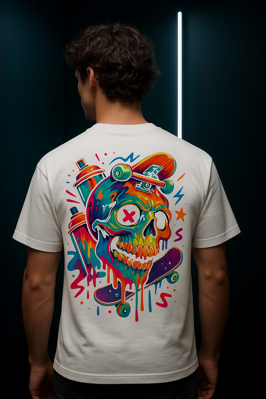 The back of the tee showcases a striking spray-paint skull graphic with dynamic splatters and paint runs in electric hues. A minimalist tag-inspired “Spray & Skull” logo on the front chest adds subtle branding without stealing the show.